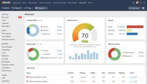 - Website audit: kiểm tra tất cả các trang và tên miền phụ của bạn dựa trên các thông số công nghệ quan trọng đối với SEO. Đối với mỗi lỗi được tìm thấy, công cụ sẽ đề xuất mức độ khẩn cấp và cách khắc phục.